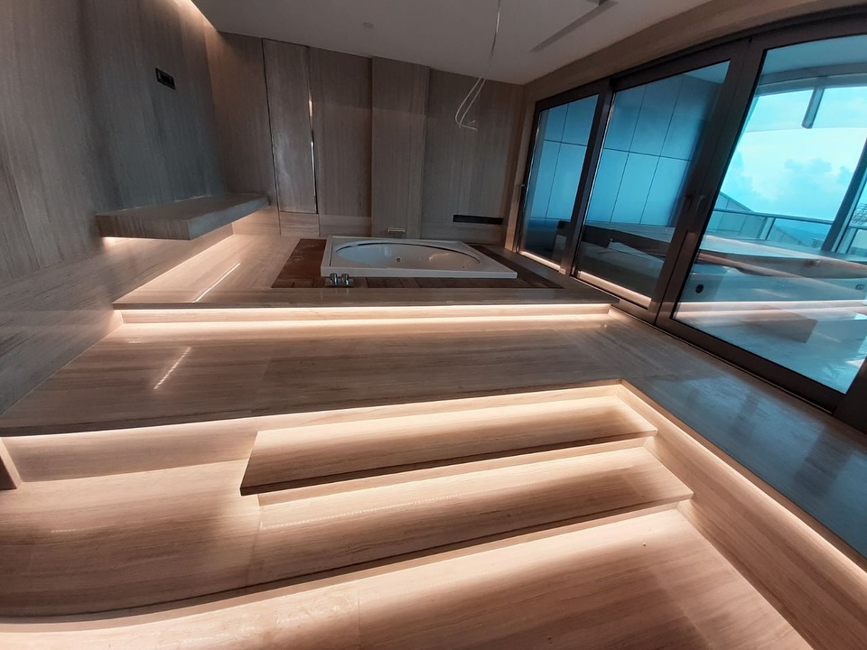 A modern spa area with recessed lighting, wood paneling, and a built-in jacuzzi. The layered design and warm tones create a serene atmosphere ideal for relaxation.
